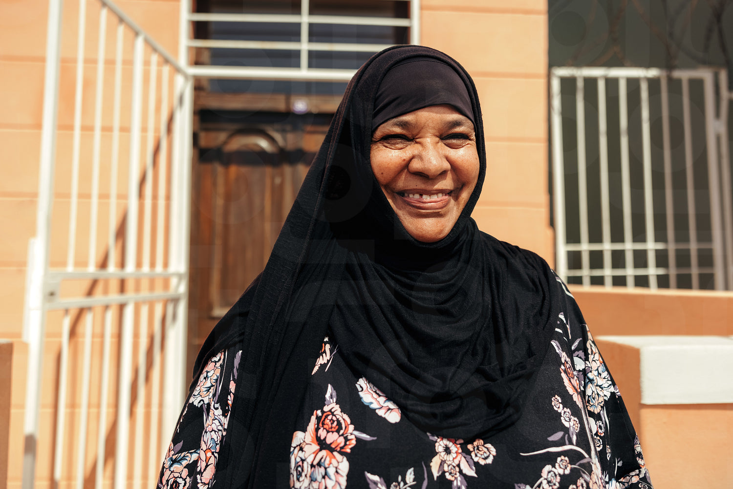 Happy Muslim woman smiling at the camera cheerfully while standing in front of her home during the day. Carefree middle aged woman wearing a hijab and standing alone.