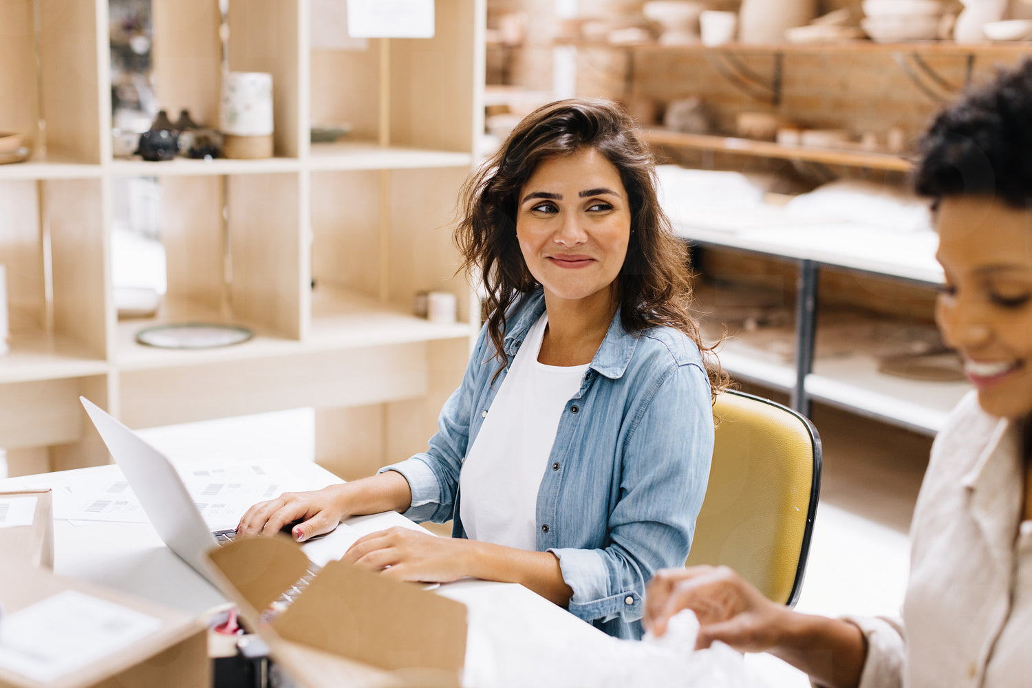Happy online store owners preparing orders for shipping in their warehouse. Cheerful businesswomen packing some of their products into boxes. Female entrepreneurs running an e-commerce small business.
