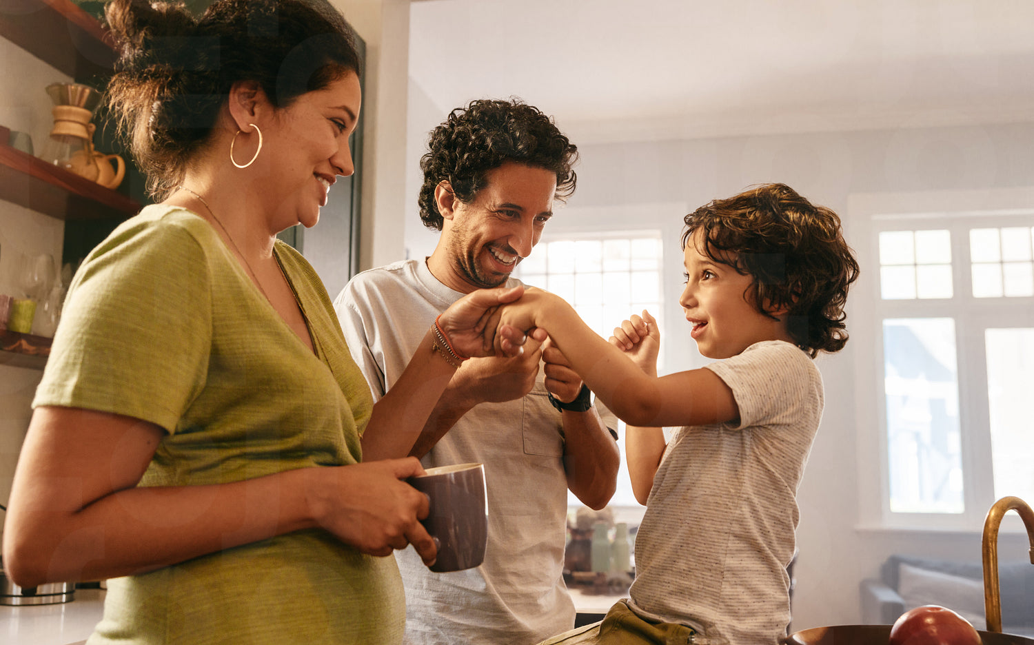 Happy parents spending some quality time with their son at home. Mom and dad playing with their young son in the morning. Young family of three smiling happily in the kitchen.