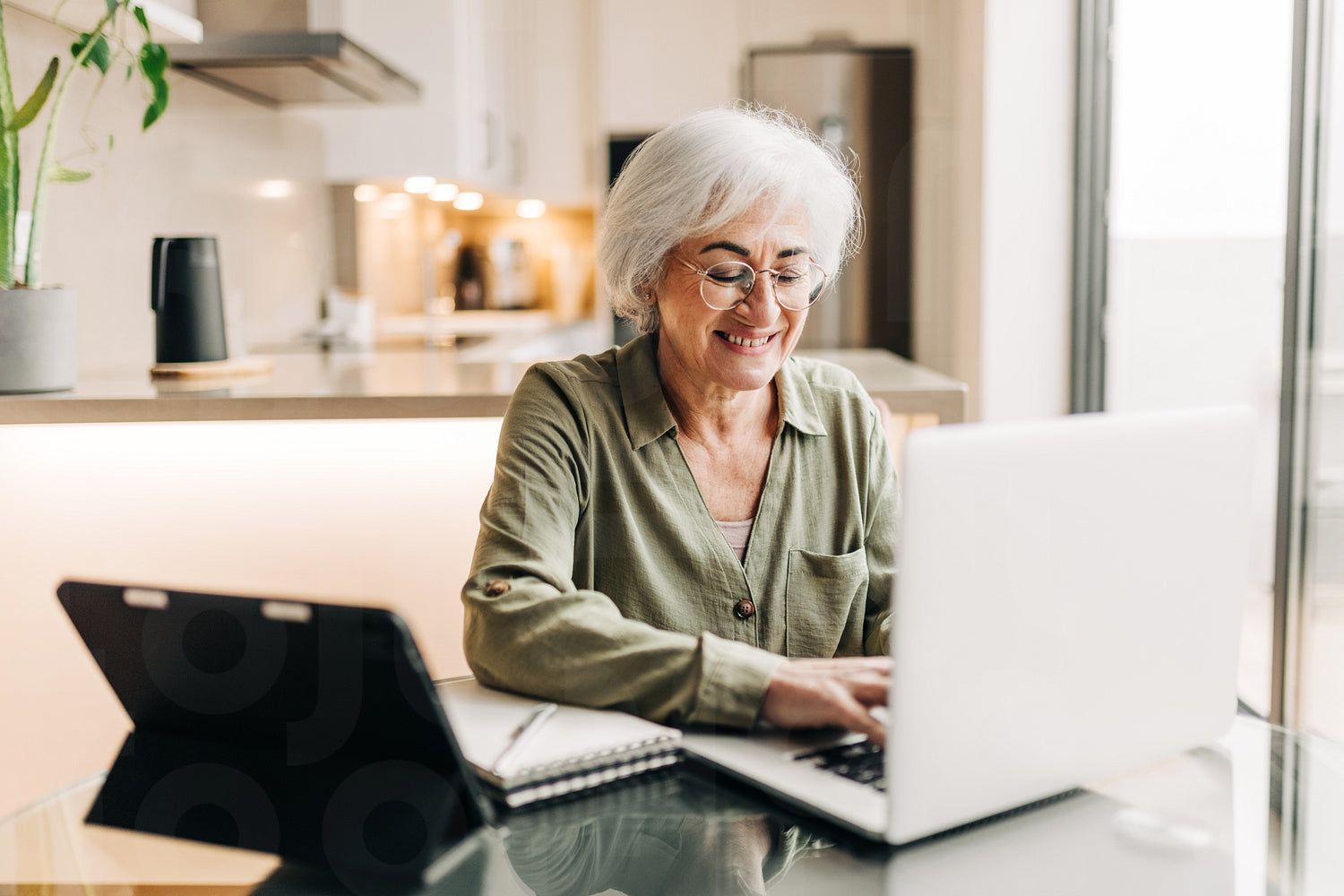 Happy senior businesswoman working in her home office