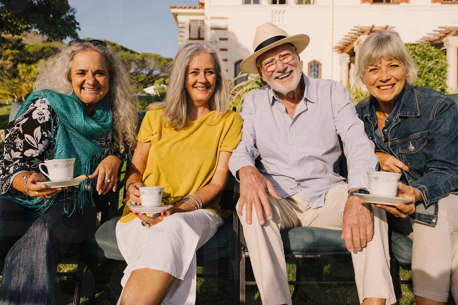 Happy senior citizens smiling at the camera while relaxing outside a retirement home. Group of carefree elderly people having tea together and enjoying their golden years.
