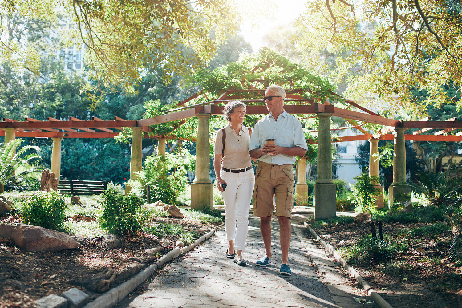 Full length portrait of happy senior couple walking together in a city park. Mature man and woman on a vacation.