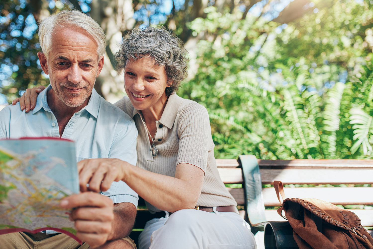 Portrait of happy man and woman reading map while sitting on a park bench. Senior couple on vacation using city map.