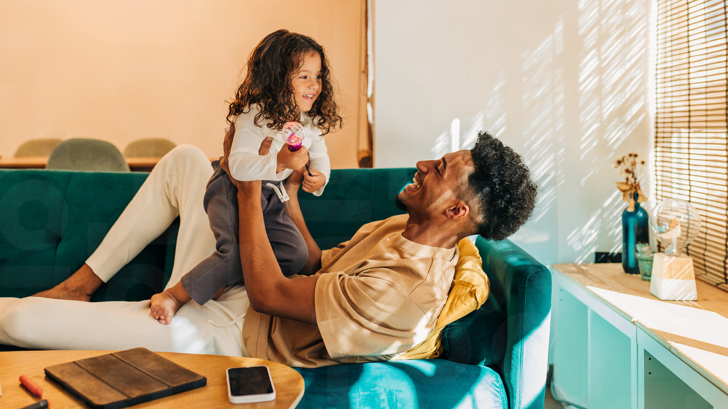 Happy single dad lifting and playing with his daughter at home
