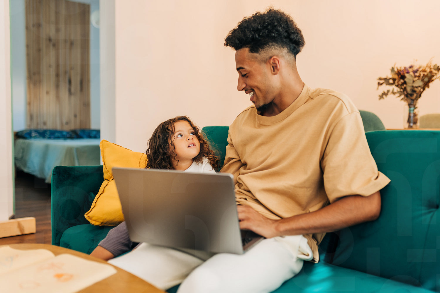 Happy single dad smiling at his daughter while sitting on a couch with a laptop. Loving dad homeschooling his daughter using online educational content. Father and daughter watching tutorial videos.