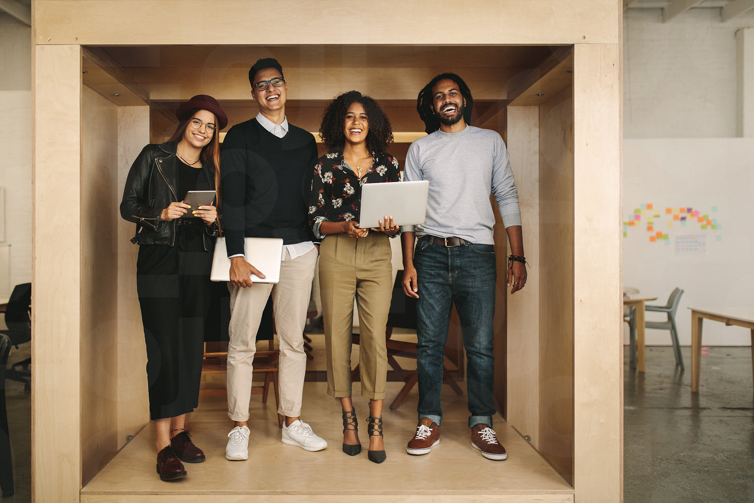 Smiling business colleagues in office standing together holding laptops and digital tablet. Teammates standing in a wooden cube enclosure in office.