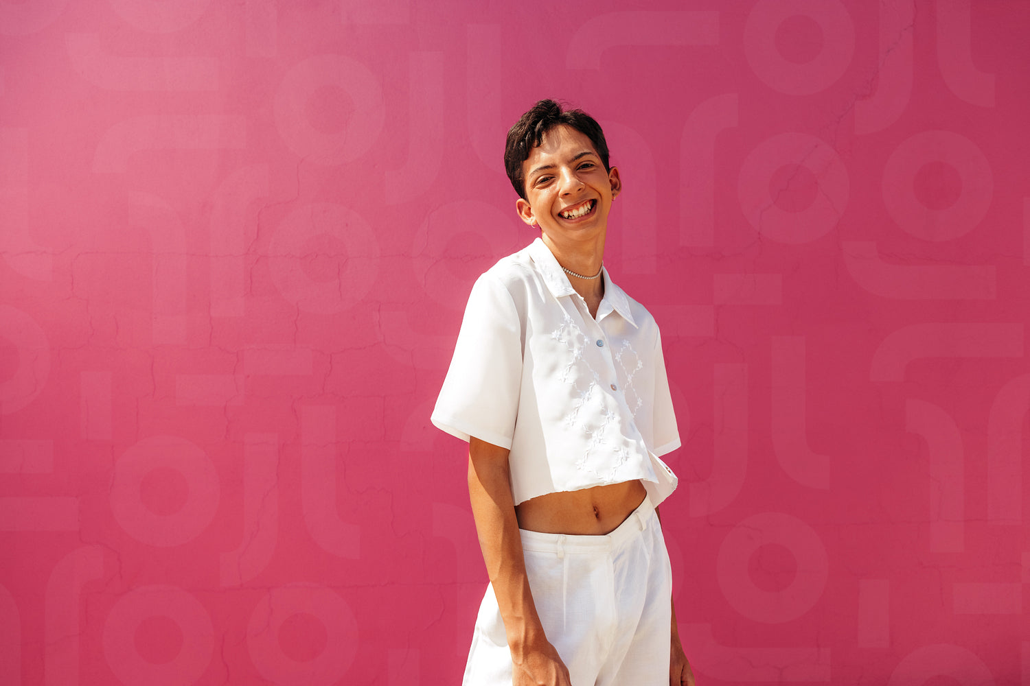Happy teenage boy standing against a pink background. Cheerful young queer boy smiling at the camera while standing in a studio. Confident gay teenager coming out and embracing his identity.