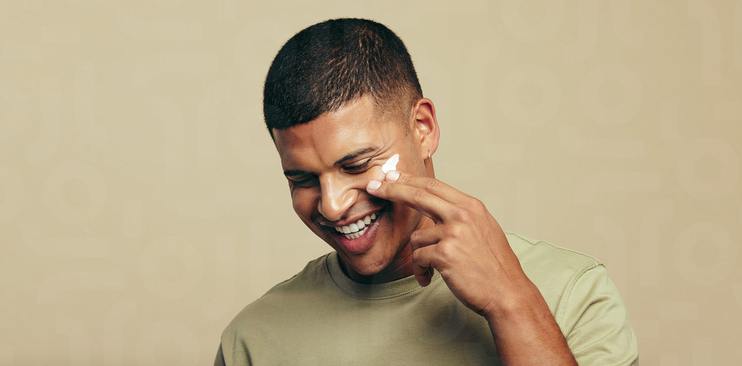 Happy with his skincare routine, young man smiles as he applies facial cream