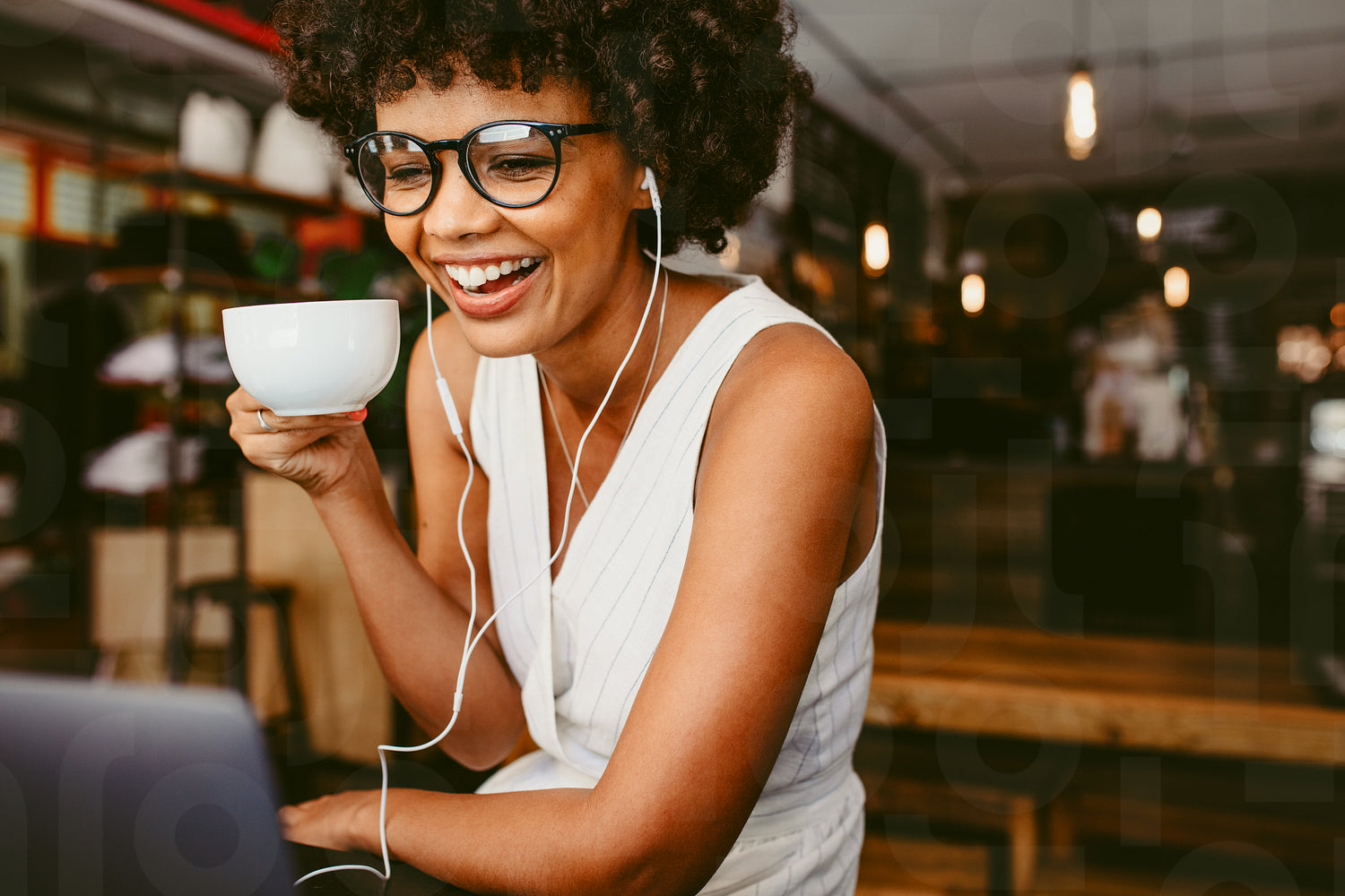 Young african woman drinking coffee and using laptop at a cafe. Smiling woman sitting at cafe drinking coffee and looking at laptop on table.