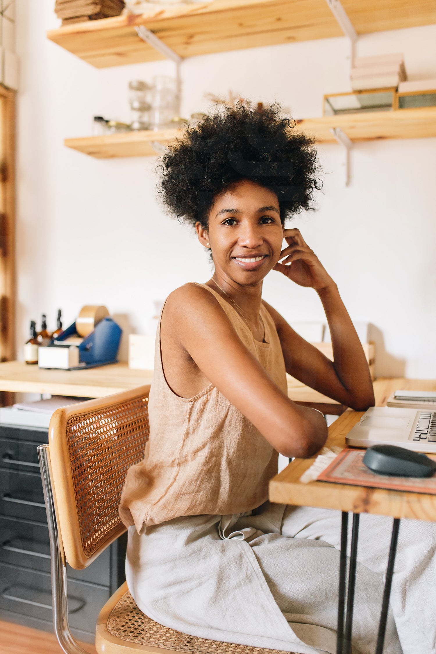 Woman smiling at camera sitting at work desk in studio. Happy woman sitting at desk in ornament workshop.