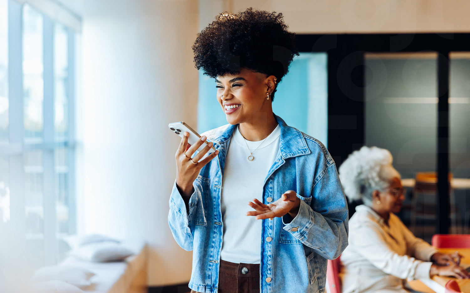 A woman in a denim jacket smiles while using a smartphone during a casual workday in a well lit indoor space; another person sits in the background, creating a friendly, collaborative scene.