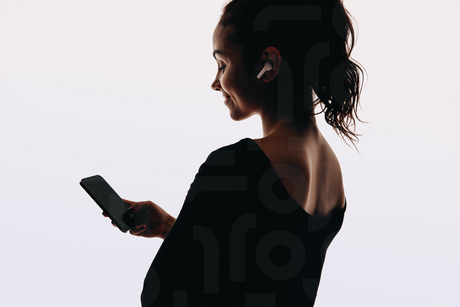 Happy young woman standing in a studio with earbuds on, holding a smartphone in her hand. She uses the device for video calls, showcasing the convenience and connection of modern technology.