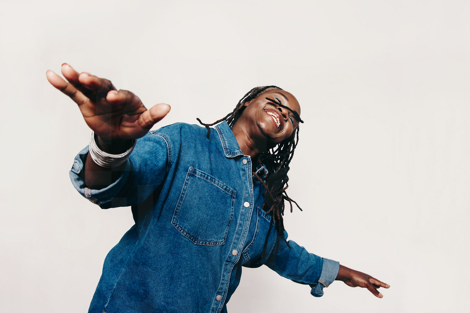 Happy woman having fun in the studio. Carefree woman with dreadlocks smiling with her eyes closed and her arms outstretched. Cheerful mature woman wearing a denim jacket and make-up.
