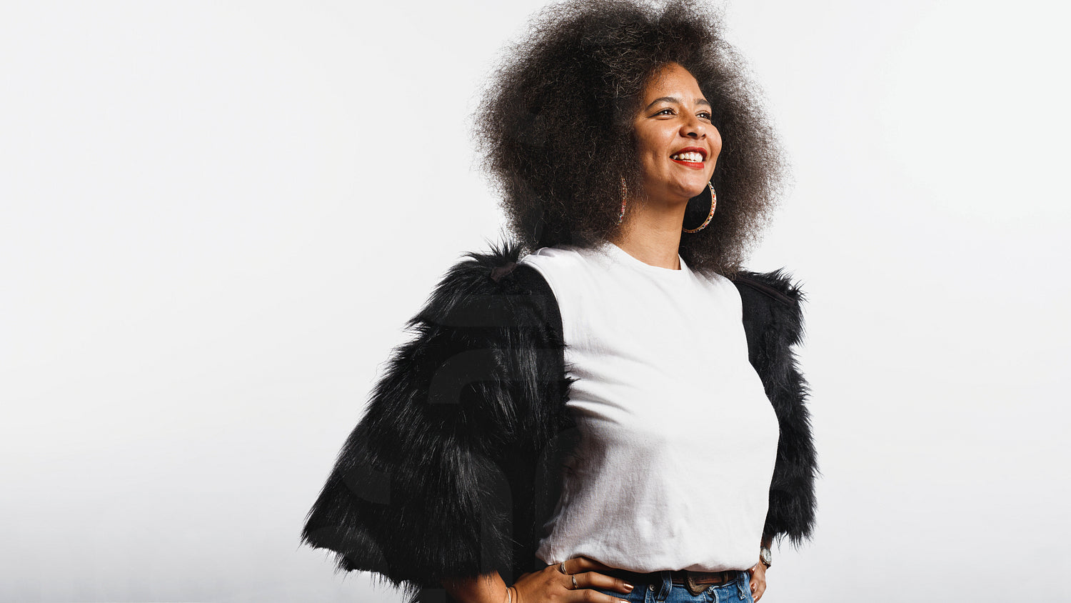 Smiling woman in afro hairstyle with blown out hair standing against white background. Portrait of cheerful woman in fur coat looking away.