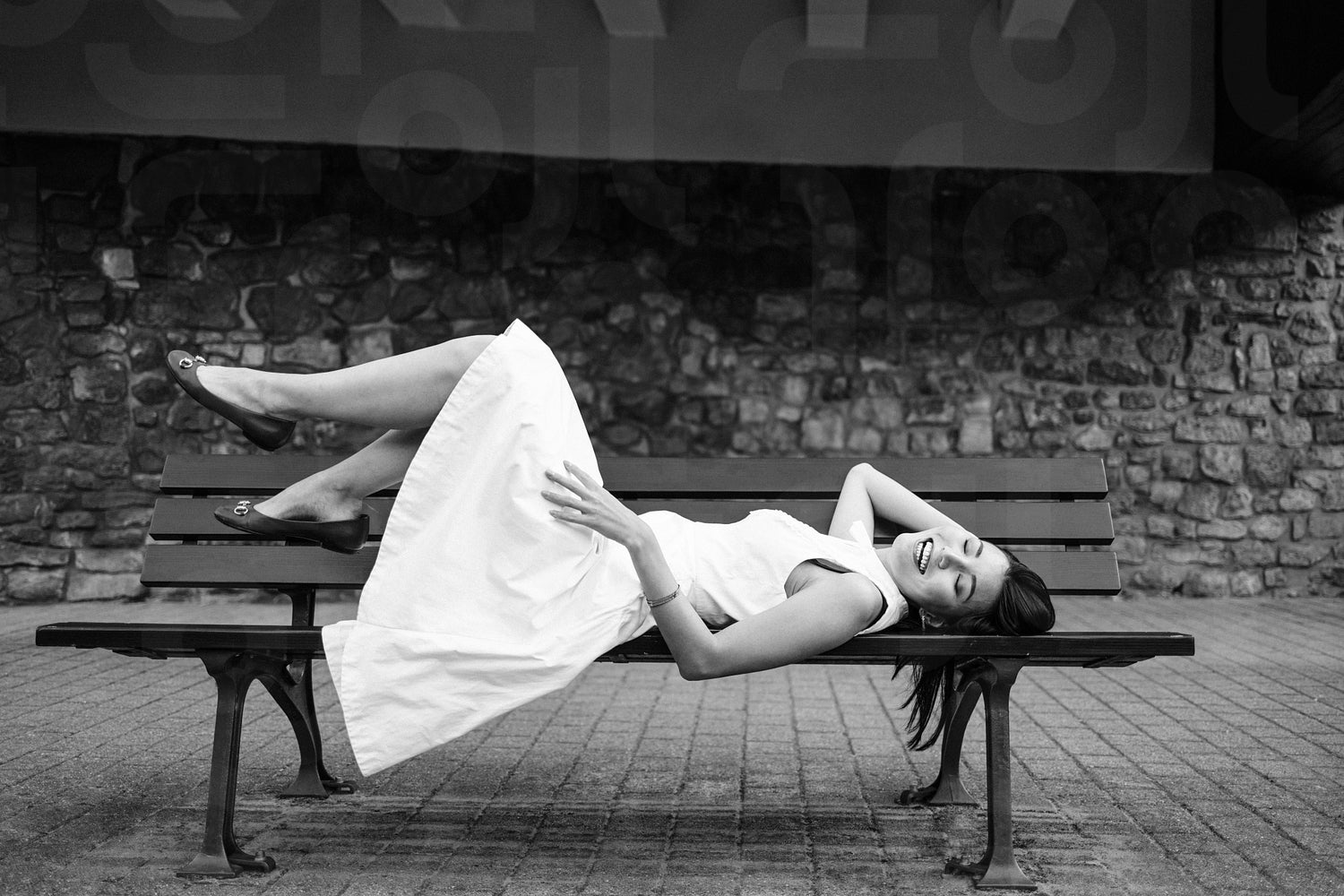 Happy young woman lying on a bench in a white dress. Female traveller having fun in a town. This photo has intentional use of 35mm film grain.
