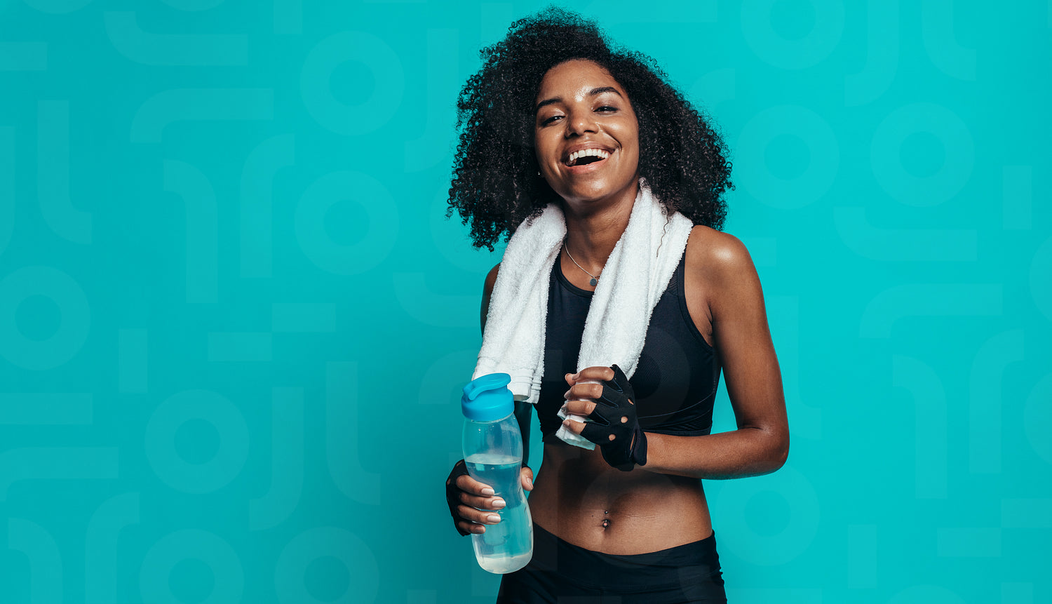 Happy young woman resting after workout on blue background. Healthy young female taking a break after exercising.