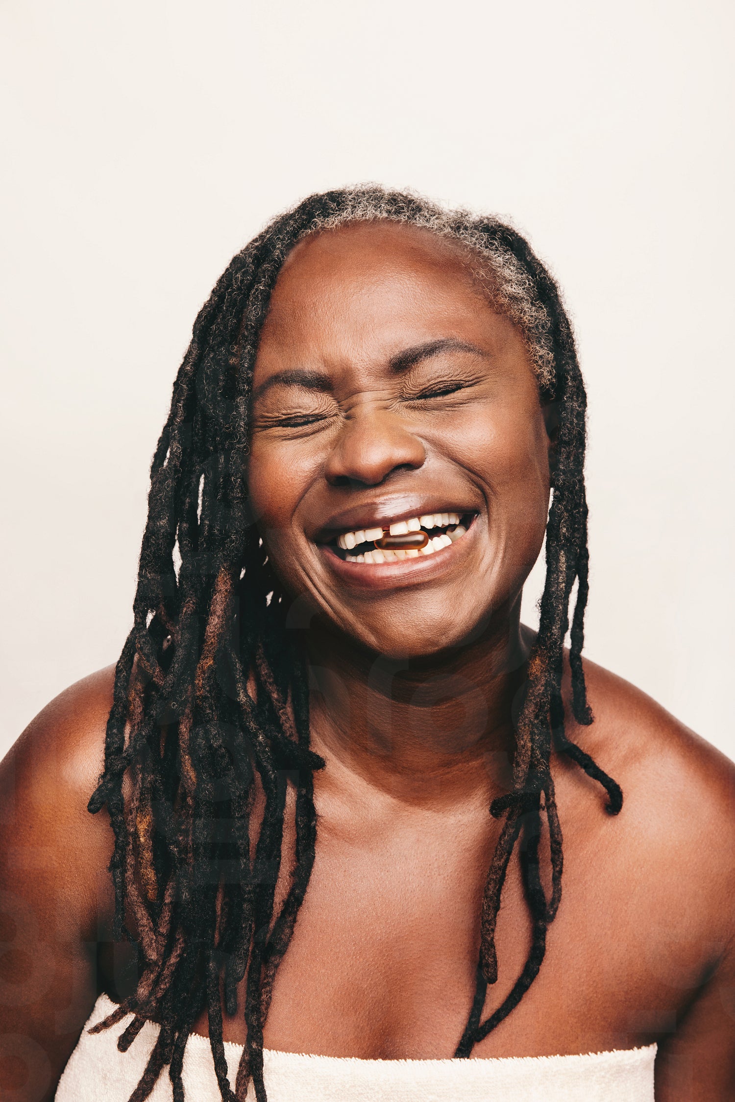 Happy woman smiling cheerfully with a capsule of Omega 3 fatty acids between her teeth. Mature woman with dreadlocks using nutritional supplements as part of a healthy self-care routine.