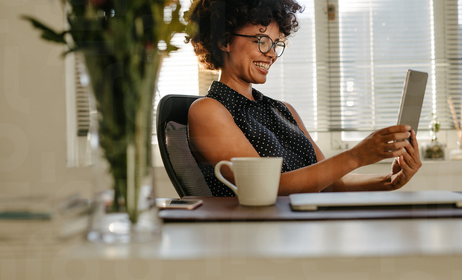 Young smiling black businesswoman sitting at her office desk and looking at the screen of the digital tablet in her hands. Happy young woman using digital tablet at her workplace.