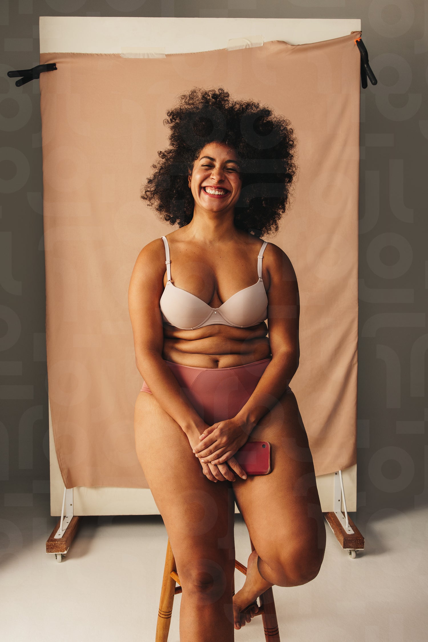 Happy woman with an Afro hairstyle wearing underwear in a studio