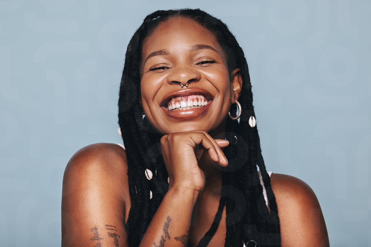 Happy woman with face piercings smiling at the camera in a studio. Young black woman feeling confident in herself.