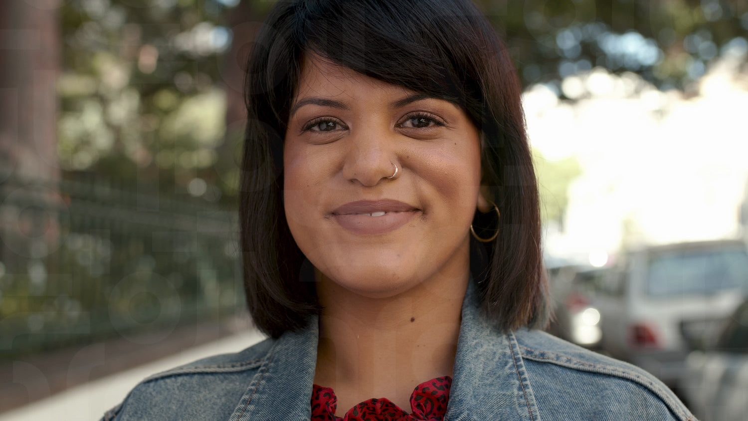 Close-up of beautiful female with nose ring and short hair smiling at camera. Pretty face of a happy mid adult woman outdoors.