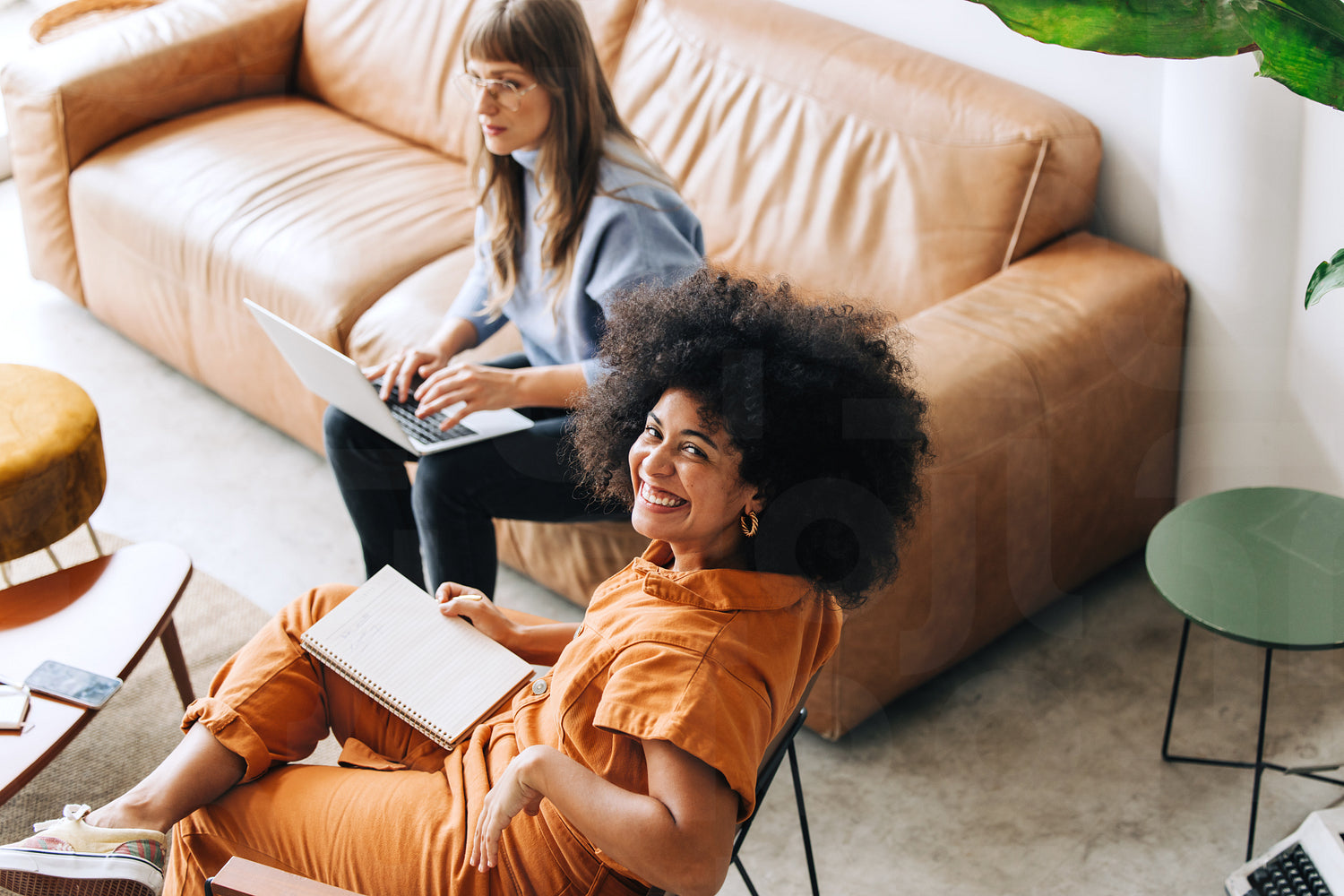 Happy young businesswoman smiling at the camera while sitting in an office with her colleague. Cheerful young businesswoman making plans in her diary while working in a lobby.