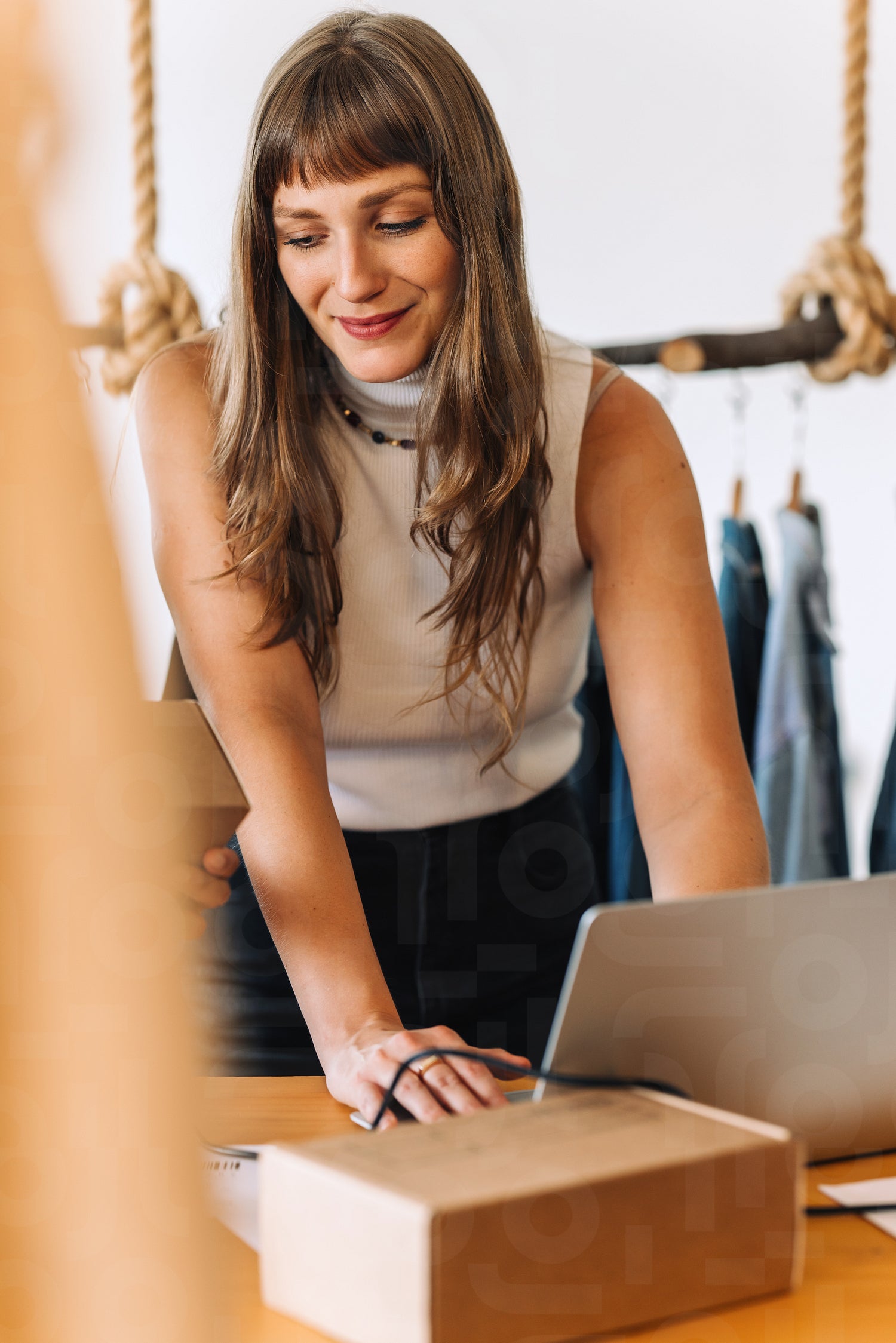 Happy young businesswoman using a laptop while preparing online orders in a clothing store. Young female entrepreneur running an e-commerce small business with her colleague.