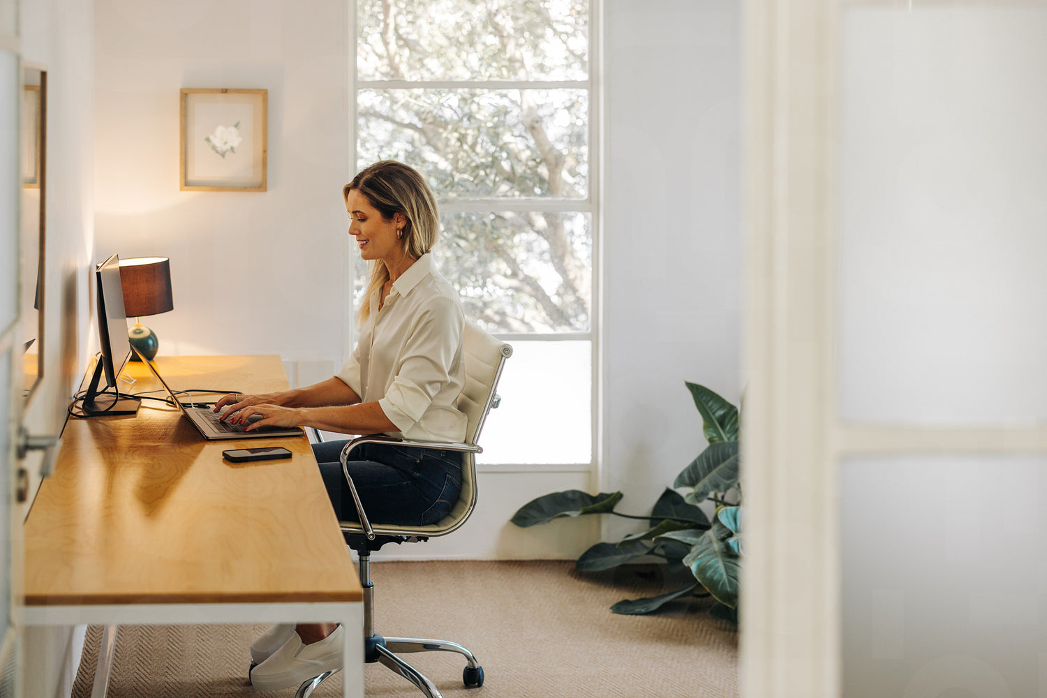 Happy young businesswoman smiling while typing on a laptop keyboard in her office. Cheerful young businesswoman consulting her business clients online.