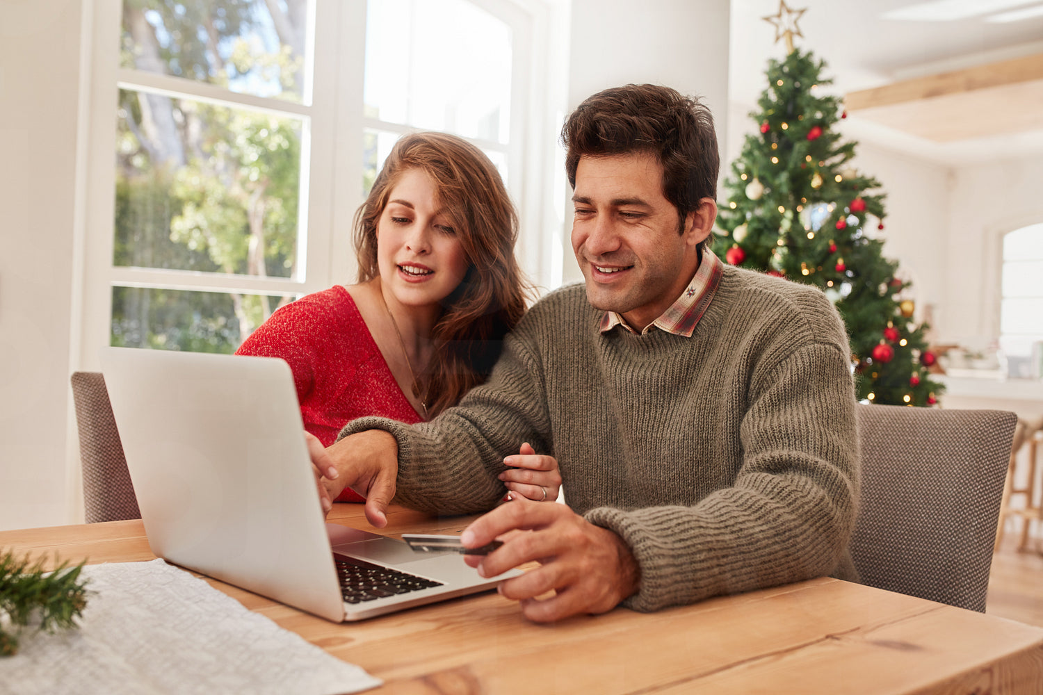 Happy young couple using credit card to shop online. Young man and woman with laptop and credit card buying online. Online christmas shopping.
