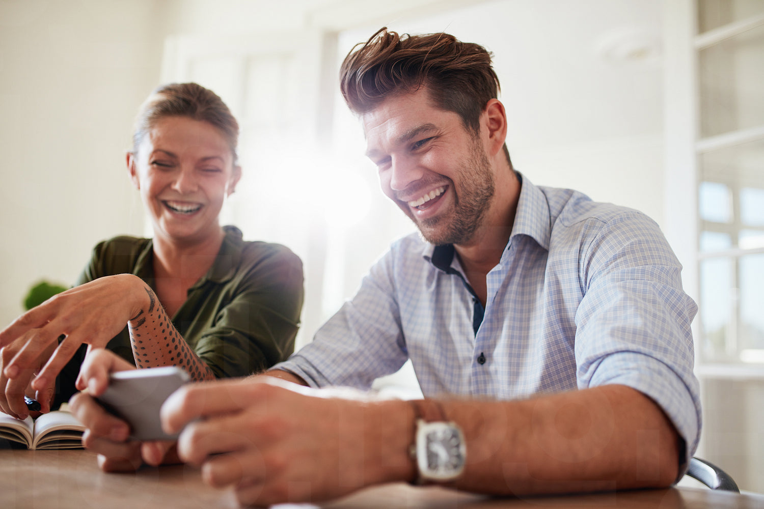 Shot of young couple sitting at table using cellphone at home and smiling. Man and woman smiling with mobile phone.