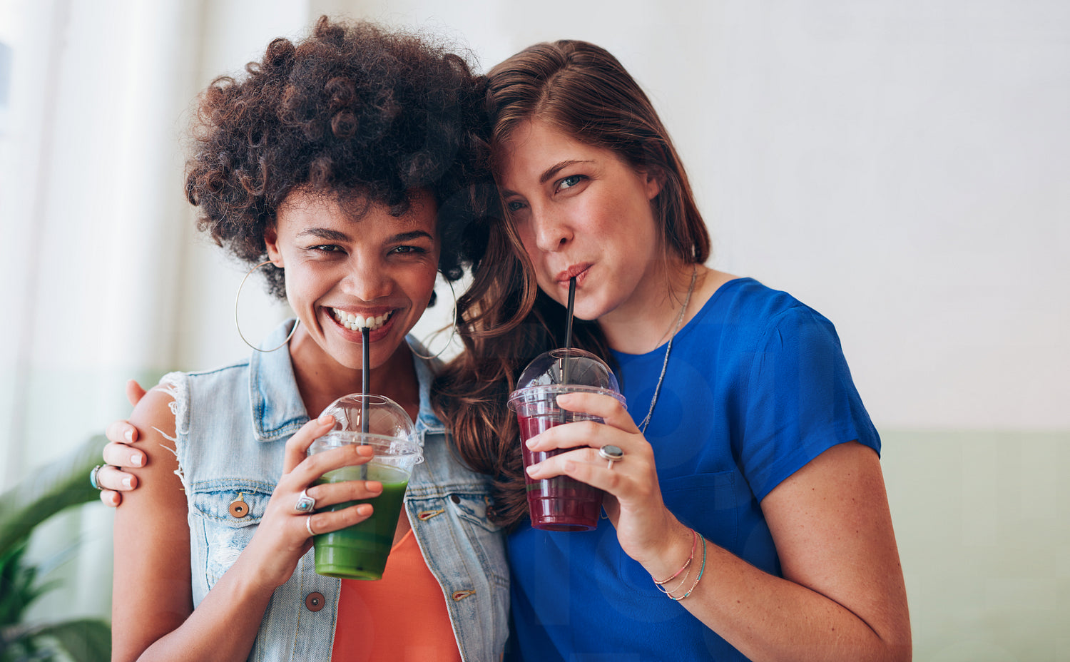 Portrait of happy young friends drinking fresh fruit juice together. Two women standing together drinking juice and looking at camera.