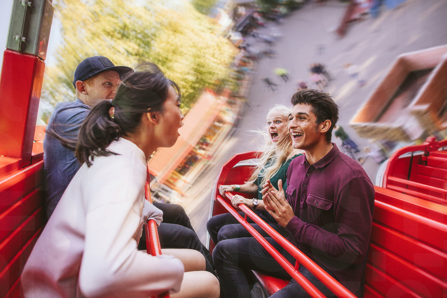 Happy young friends having fun on amusement park ride