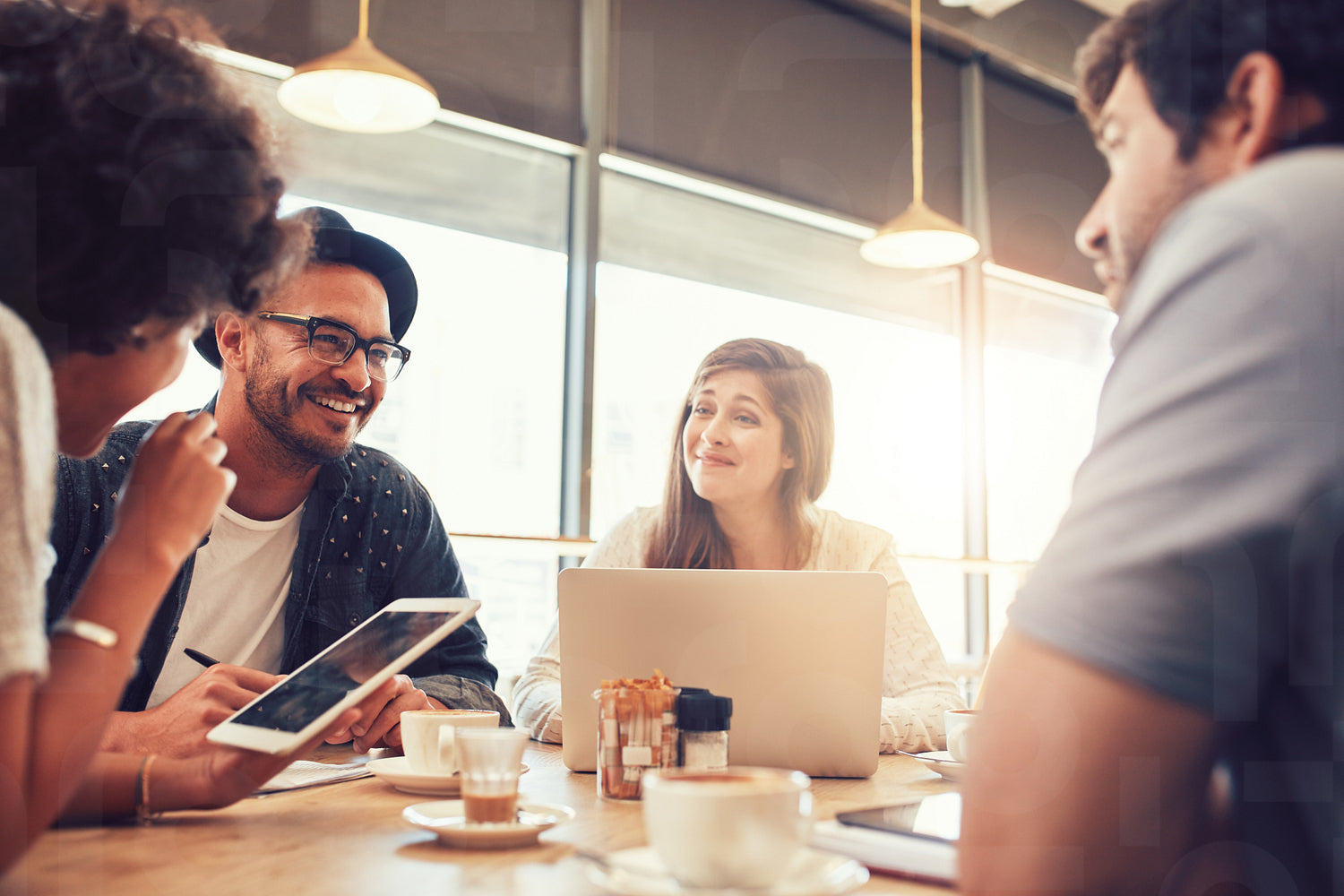 Portrait of happy young friends sitting and talking at a cafe with digital tablet and laptop