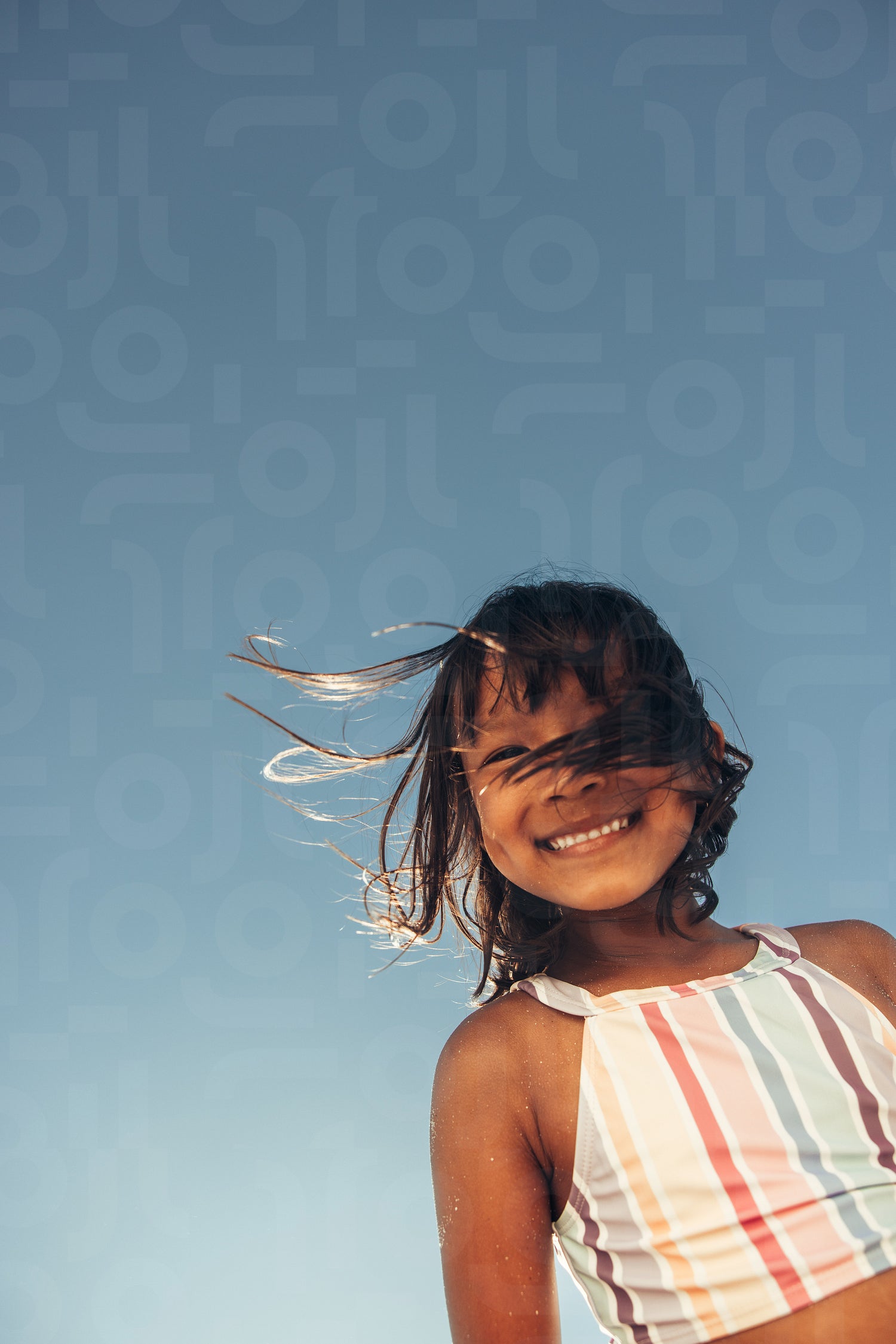 Happy young girl having fun at the beach during summer vacation. Adorable little girl smiling at the camera while standing with the sky in the background.