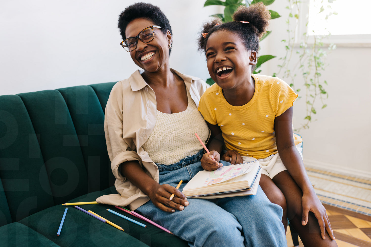 Happy young girl sitting with her mom o the couch, laughing and having fun as they engage in a colour drawing activity. Mother and daughter creating a fun, educational environment at home.