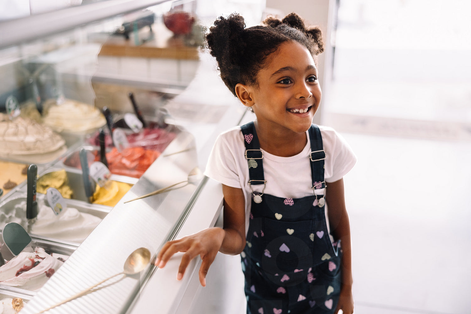 A joyful young black girl with a bright smile looks excited choosing from a variety of ice cream flavors at a shop.
