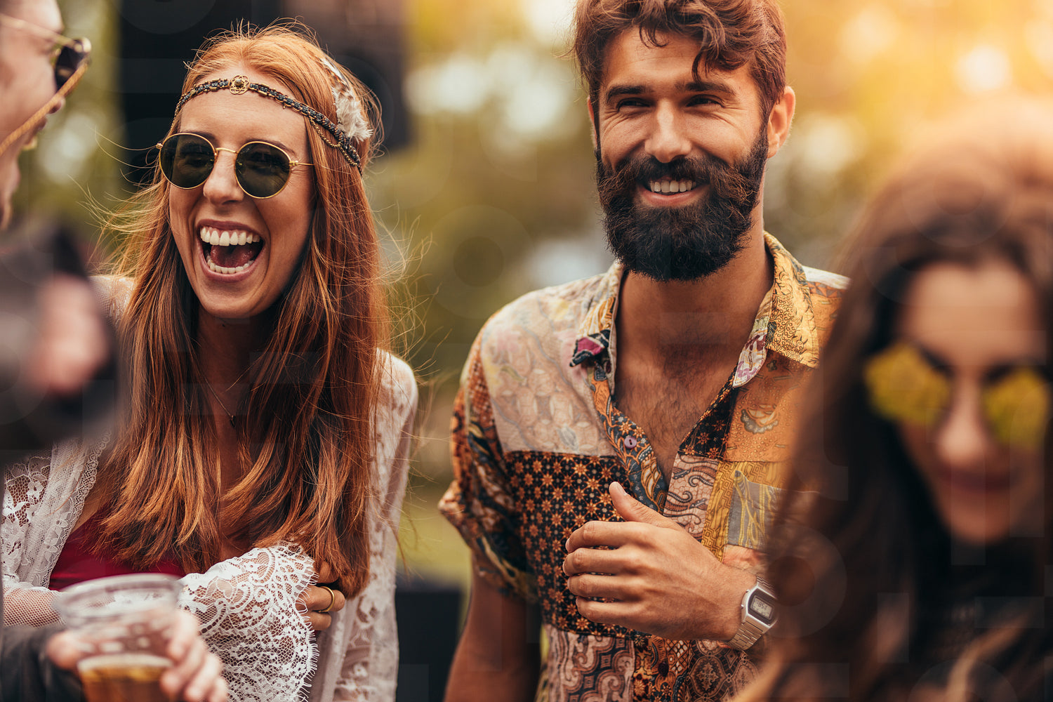 Happy young hippie friends at music festival