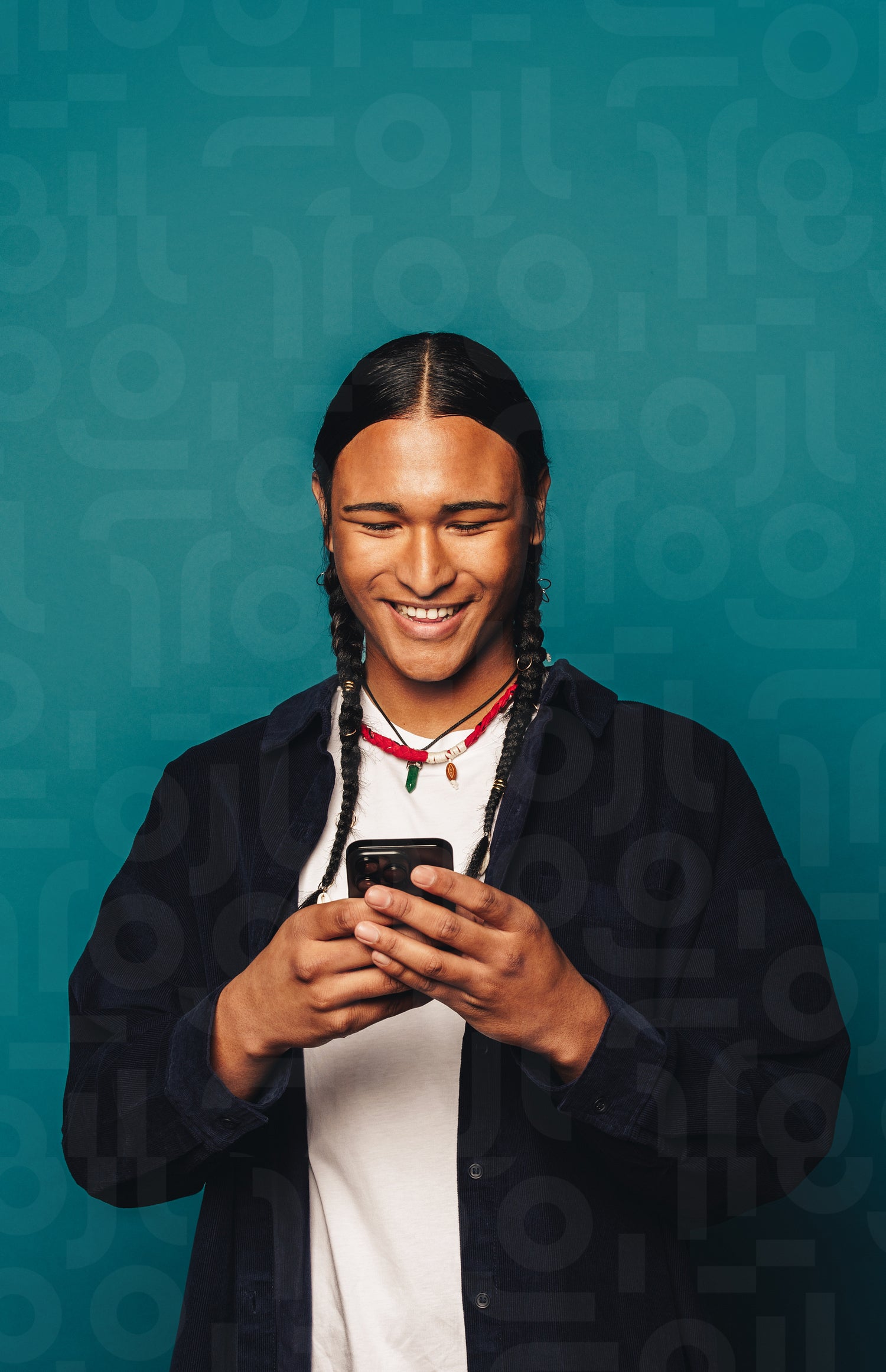 Happy man with long braided hair, wearing casual clothing and a native American necklace, standing in a studio. He smiles while reading a message on his smartphone against a blue background.
