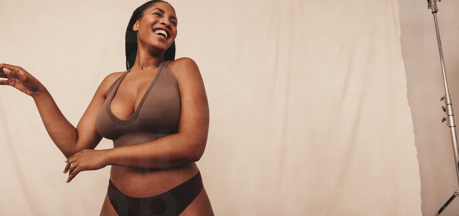 Happy young woman laughing in a studio. Cheerful young woman wearing brown underwear against a studio background. Body positive young woman celebrating her natural body and beauty.