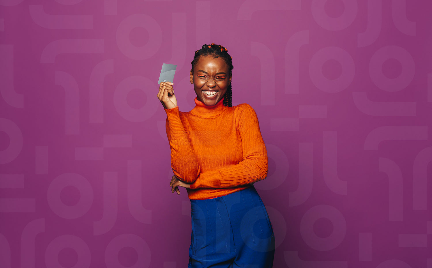 Cheerful Gen Z woman with braids, casual clothing, and a vibrant purple background stands in a studio. Holding a debit card, she's ready to make a contactless payment, tapping to pay. A perfect representation of cashless banking and modern payment.