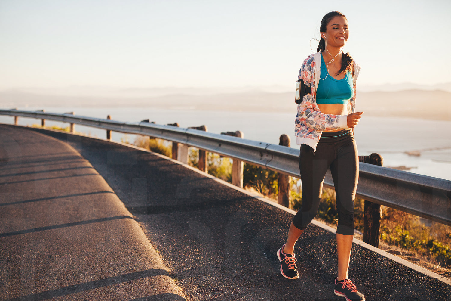 Portrait of happy young woman running on country road. Caucasian female model on morning run outdoors.