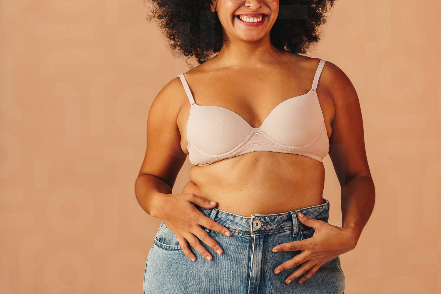 Happy plus size woman smiling cheerfully while wearing a bra and jeans in a studio. Body confident woman with Afro hair feeling comfortable in her natural body and curves.
