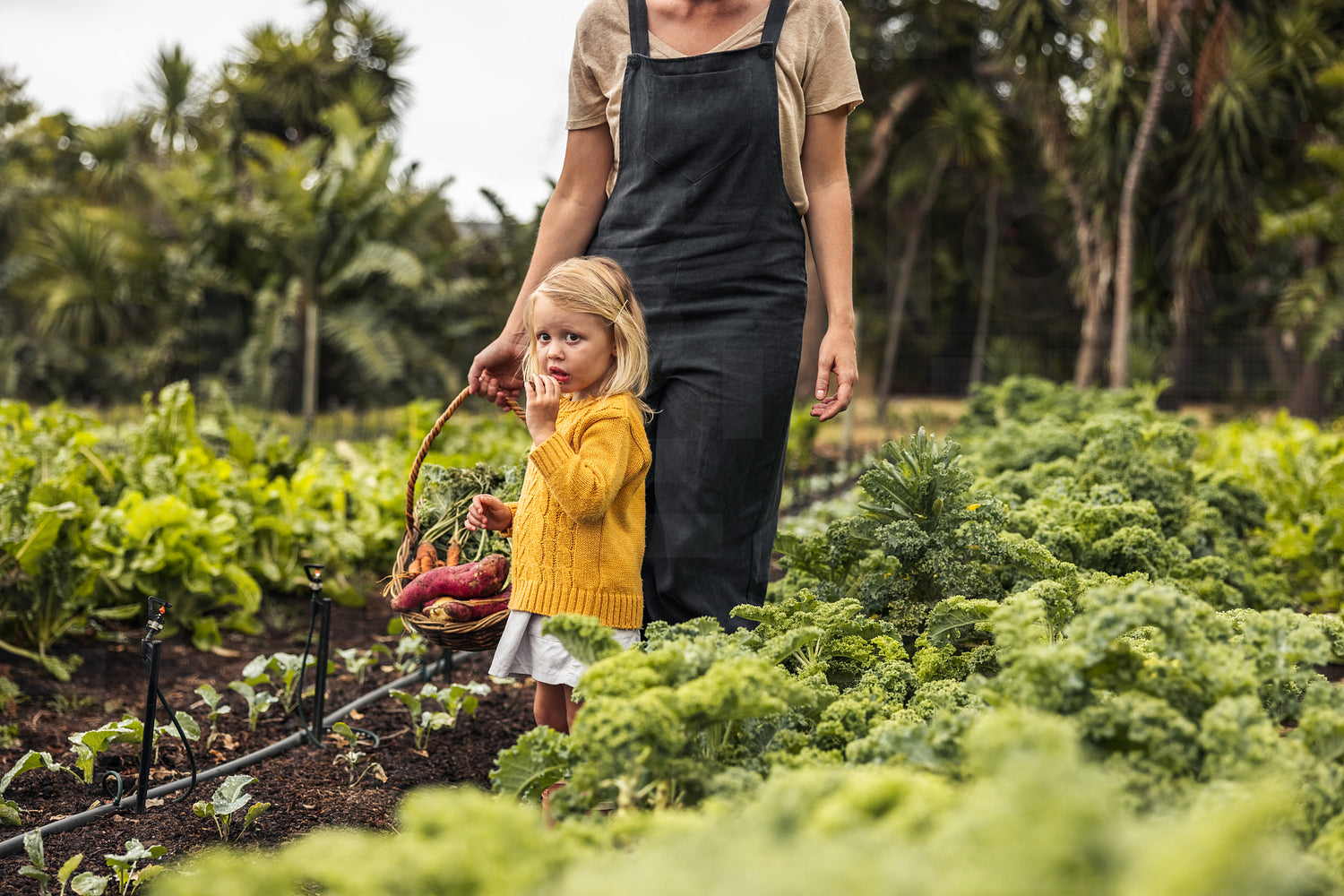 Harvesting with mommy. Adorable little girl standing in a vegetable garden with her mother behind her. Self-sustainable young family gathering fresh vegetables on an organic farm.
