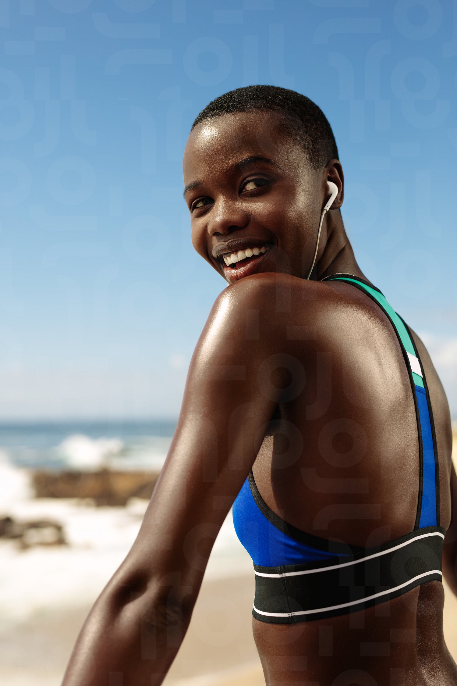 African woman in sportswear taking a break after exercising outdoors. Fitness female wearing listening to music on earphones and smiling.