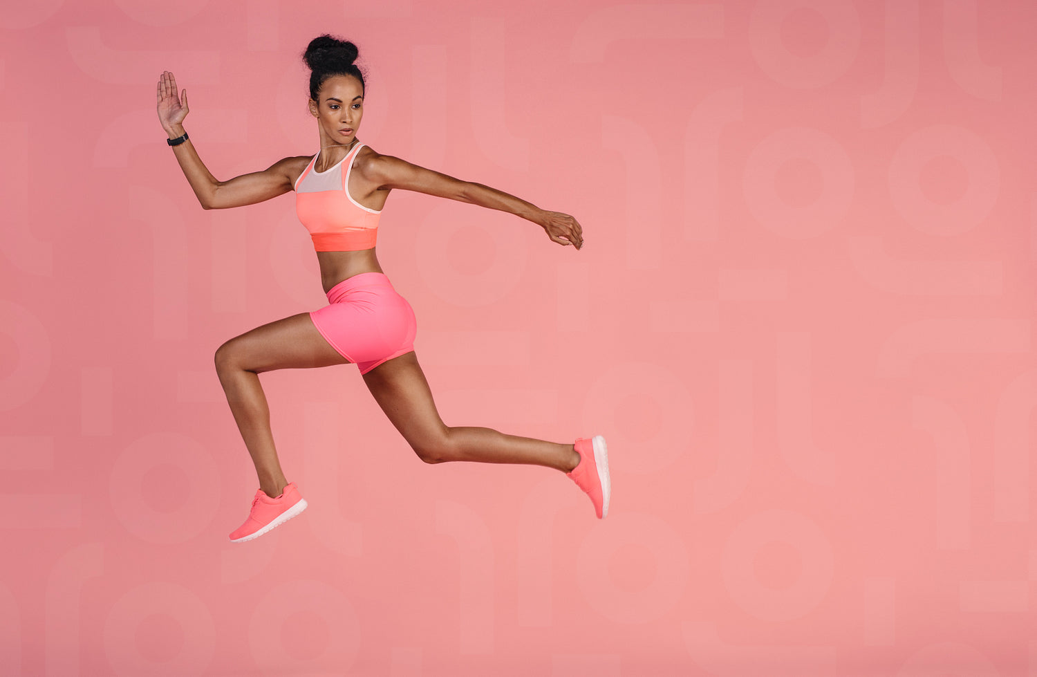 Woman in sportswear running over pink background. Full length shot of healthy young african woman sprinting.