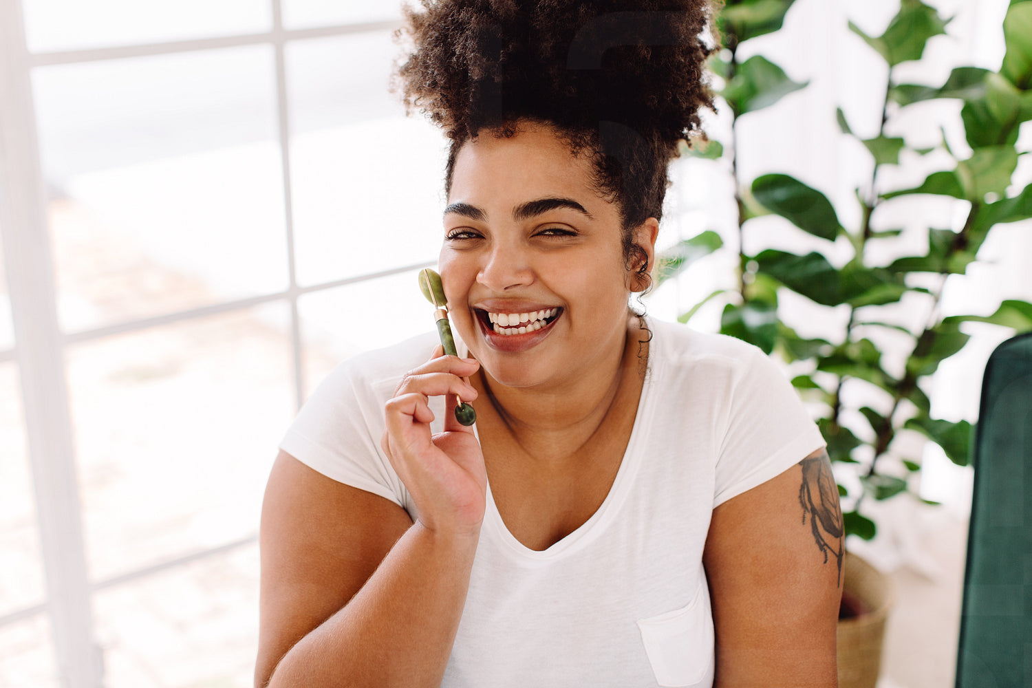 Woman smiling while applying massage roller on face. Attractive female with jade roller for facial skincare.