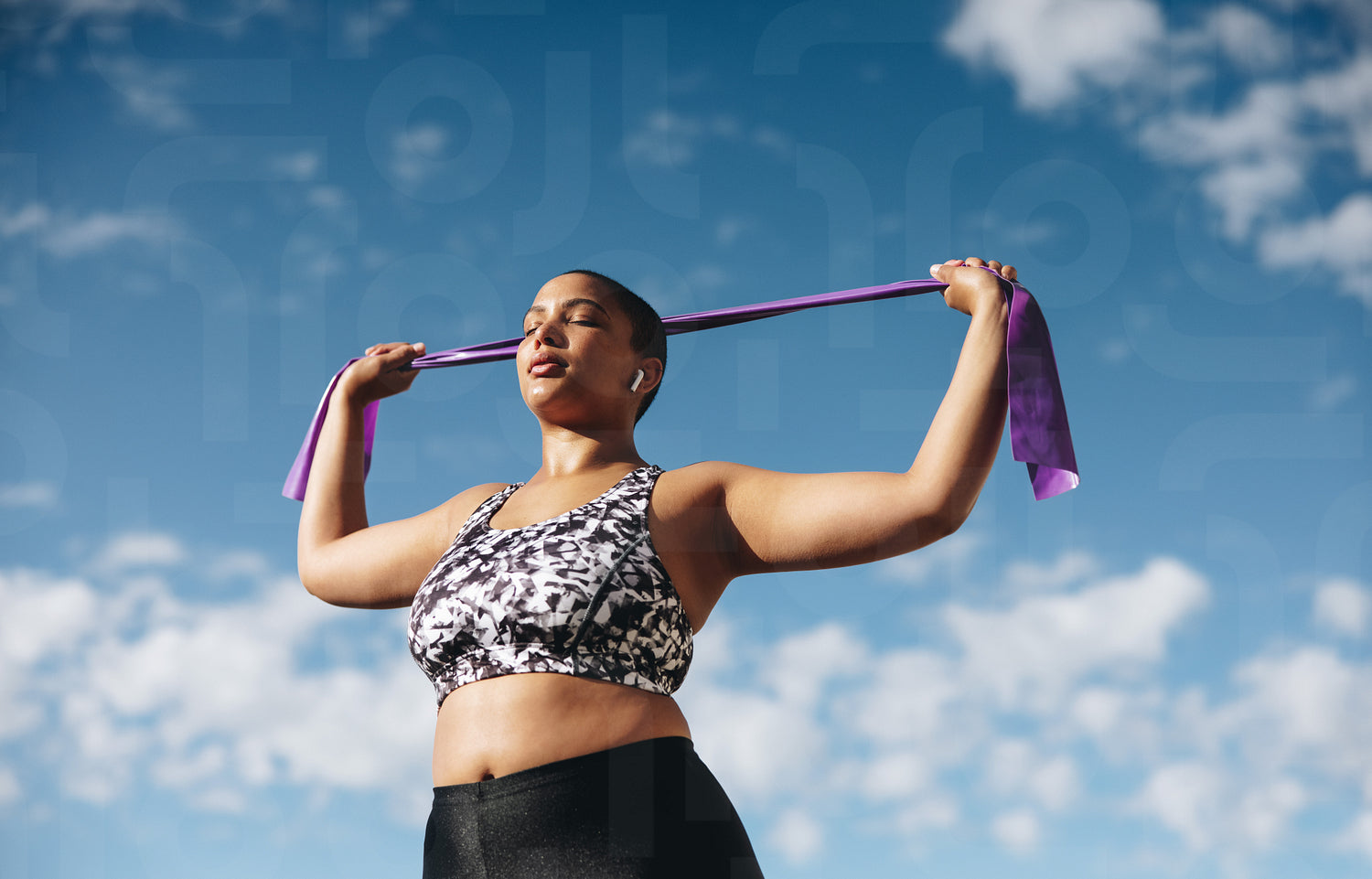 Healthy woman exercising with resistance band against sky. Female in sportswear doing resistance band workout outdoors in morning.