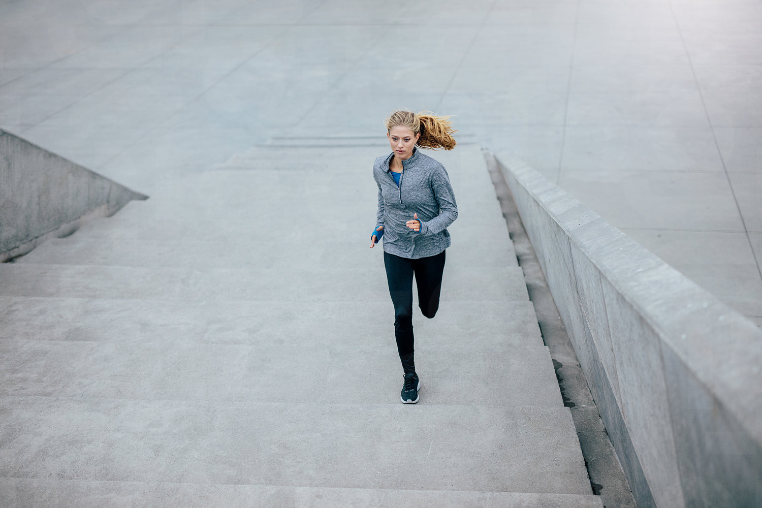 Shot of fitness female running up the steps in city. Healthy woman on morning run.