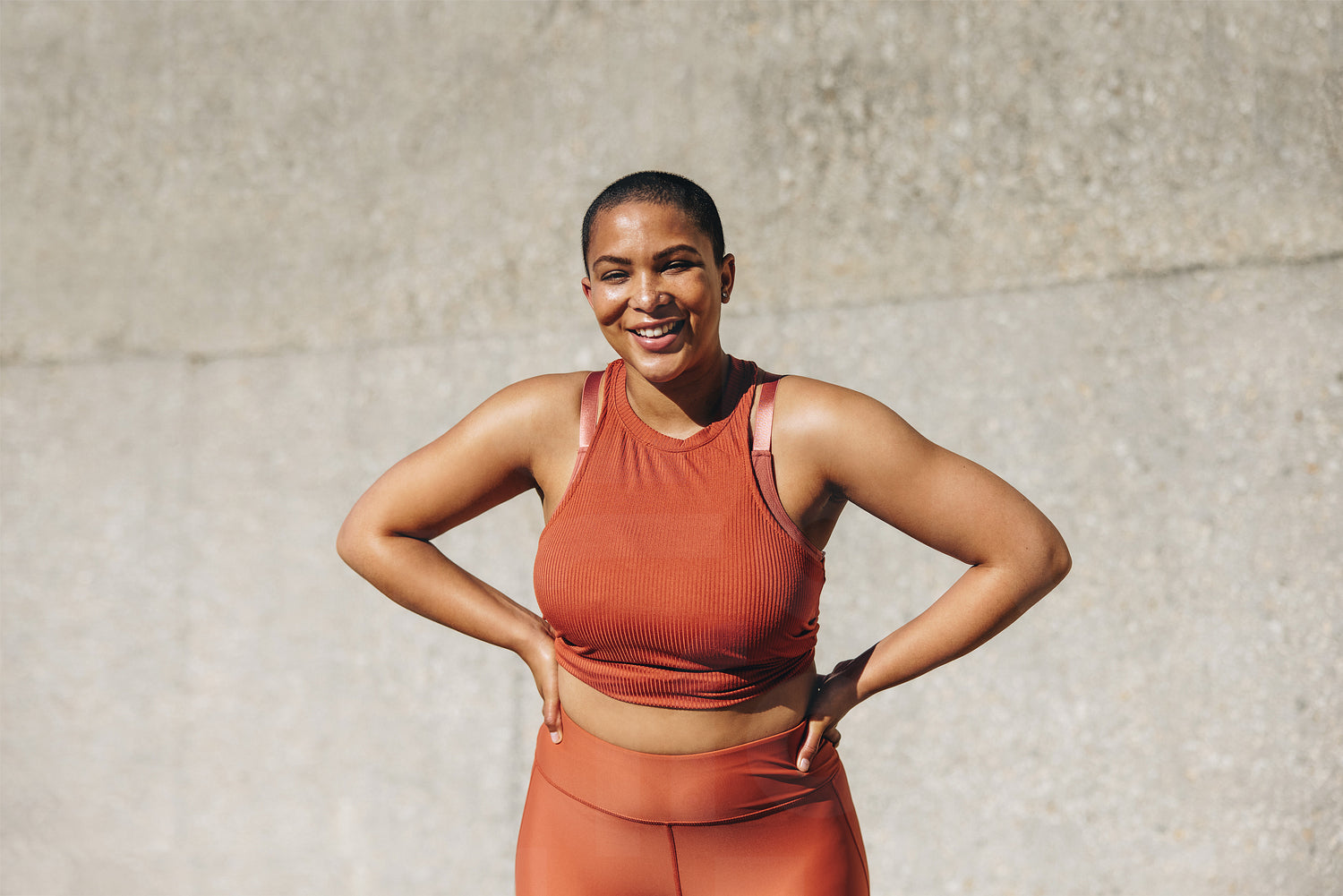 Smiling plus size woman sportswear standing with her hands on hips after workout. Healthy woman relaxing after physical training session outdoors.