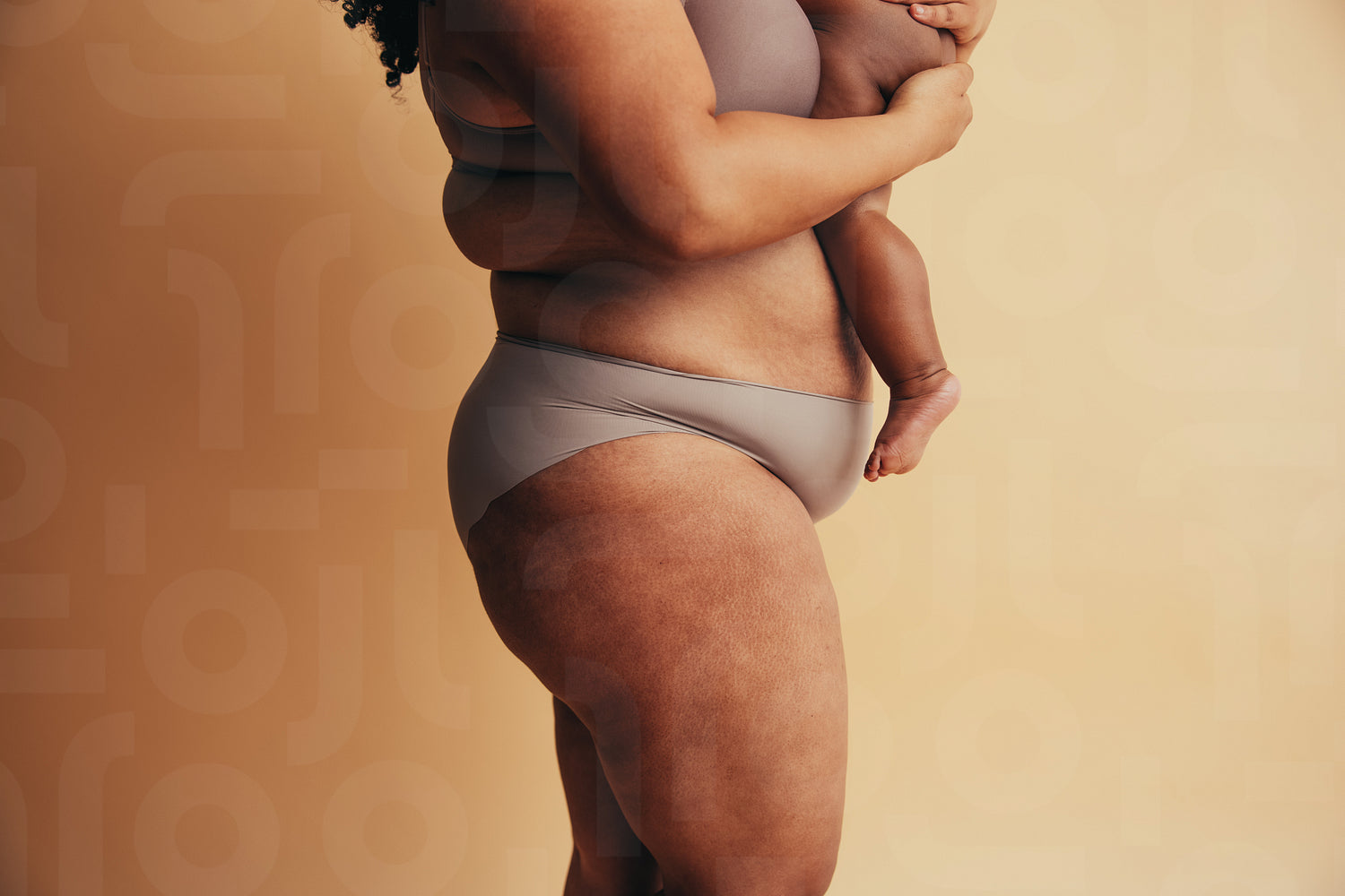 Side view of a mother carrying her baby standing against brown background. Healthy woman with baby.